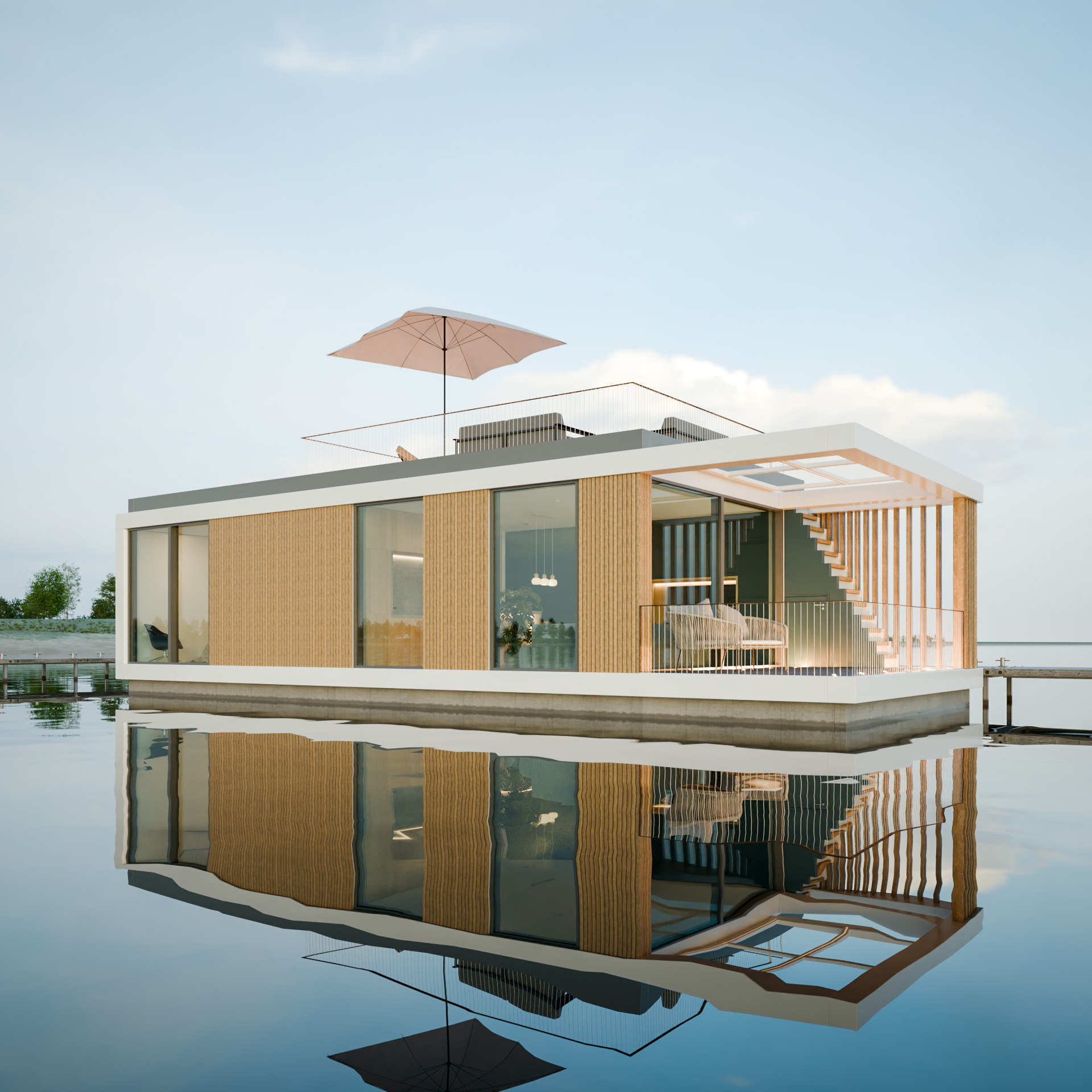 Ein herausragendes Merkmal der Floating Homes Purity-Line sind die großzügigen Panoramafenster, die nicht nur einen unverbaubaren Blick auf das umgebende Wasser bieten, sondern auch die natürliche Schönheit des Standorts ins Innere des Hauses holen. Hier werden Tages- und Jahreszeiten zum untrennbaren Bestandteil. Die hellen Räume vermitteln ein Gefühl von Großzügigkeit und Freiheit, während sie gleichzeitig durch eine geradlinige und klare Formensprache charakterisiert sind.
